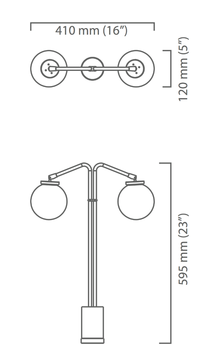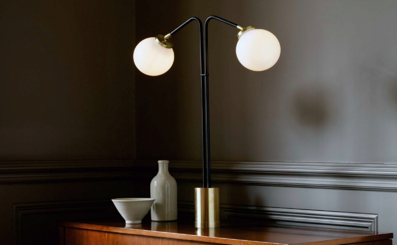 Dieses elegante Design besitzt eine klassische Ausstrahlung. Die geschwungenen Hälse der doppelten Arme schaffen eine harmonische Balance, die dem Objekt eine besondere ästhetische Wirkung verleiht. Der Kontrast zwischen Bronze- und satiniertem Messingfuß und den schwarz lackierten Stielen verstärkt den visuellen Reiz der schlichten Konstruktion aus Kugel und Stiel, die durch die kugelförmigen Opalglasschirme elegant ergänzt wird.