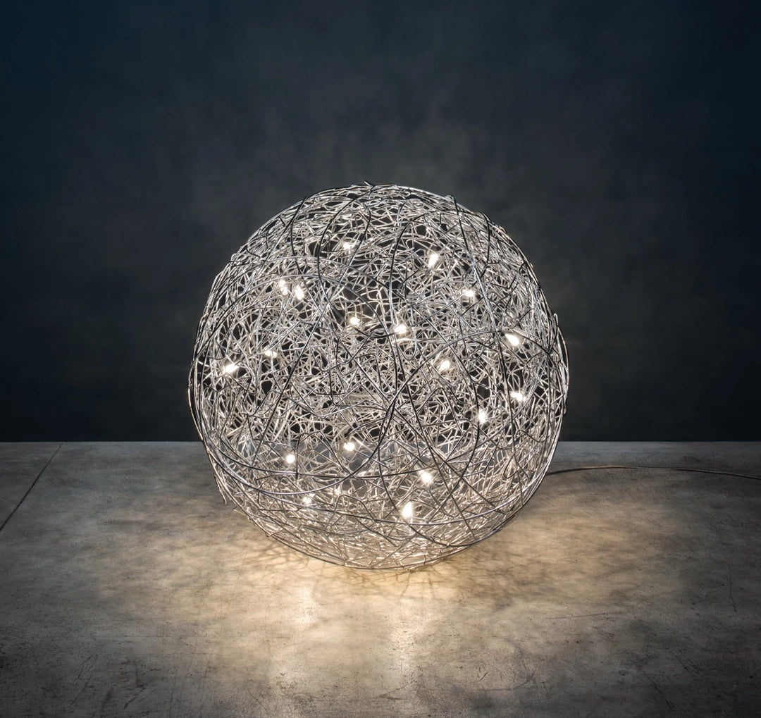 Die Ausführung aus naturbelassenem Aluminiumdraht wirkt zeitgemäß und puristisch und fügt sich harmonisch in moderne Wohnräume, Design-Livingbereiche sowie hochwertige Objekt- und Contracträume ein. Das Licht tritt sanft durch das Drahtgeflecht und erzeugt ein faszinierendes Spiel aus Reflexionen und Schatten.