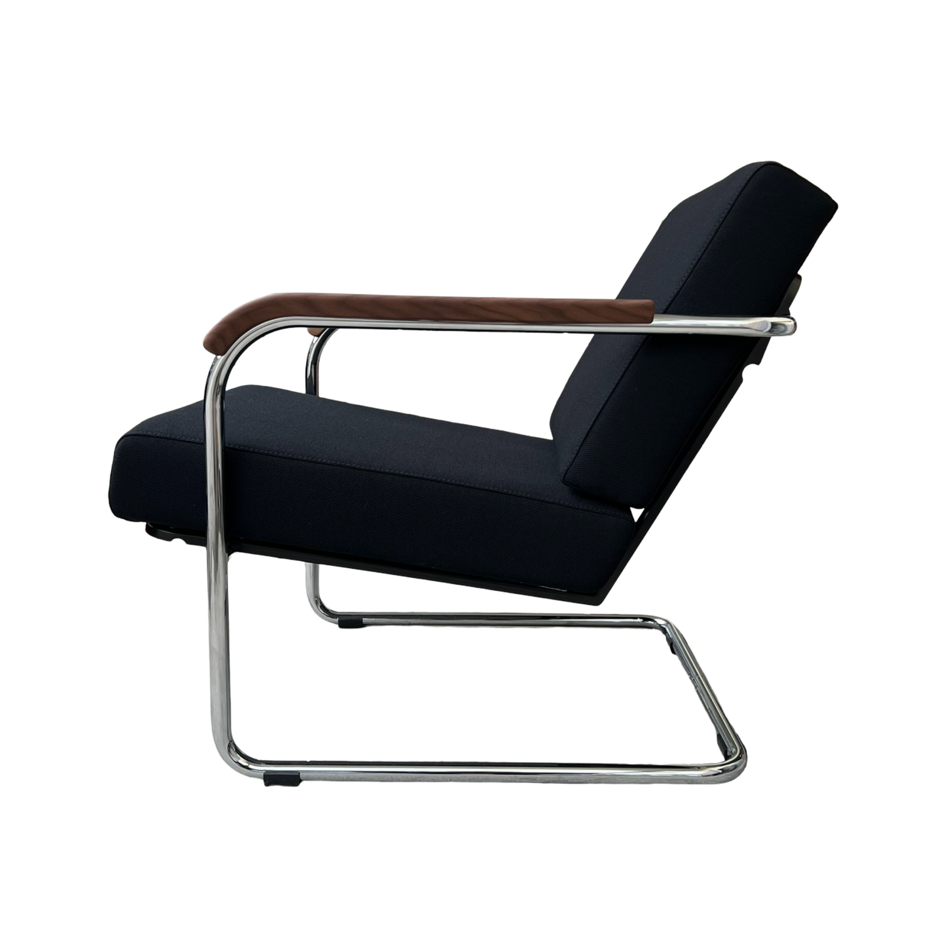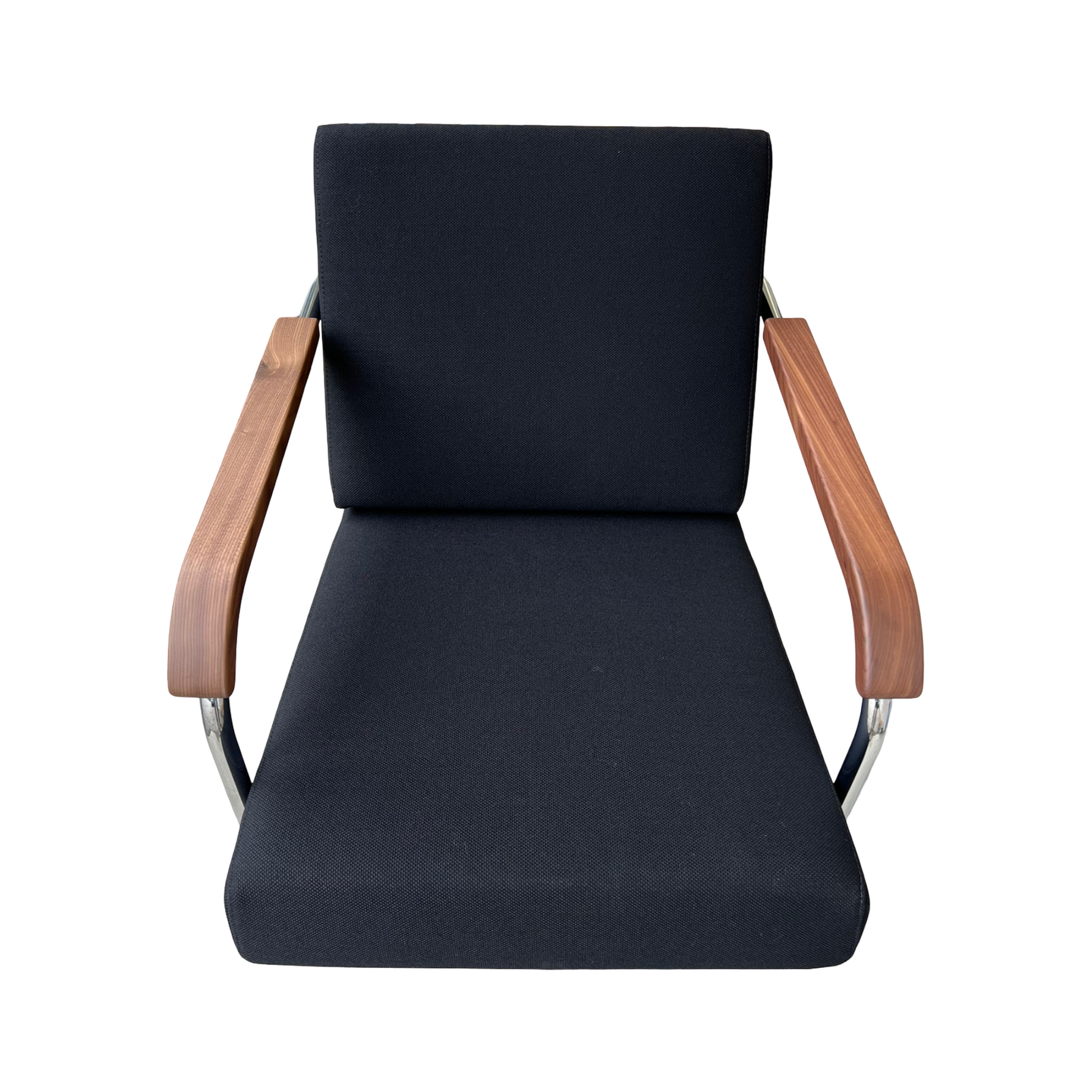 Das Gestell aus verchromtem Stahlrohr verleiht Leichtigkeit und Stabilität, während die Armlehnen aus amerikanischem Nussbaumholz dem Sessel Wärme und Eleganz geben. Die mit Taschenfederkern gepolsterten Kissen, bezogen mit schwarzem Stoff, bieten hohen Sitzkomfort. Mit einer einfachen Handbewegung lässt sich zudem die Sitzposition in zwei Stufen verstellen.