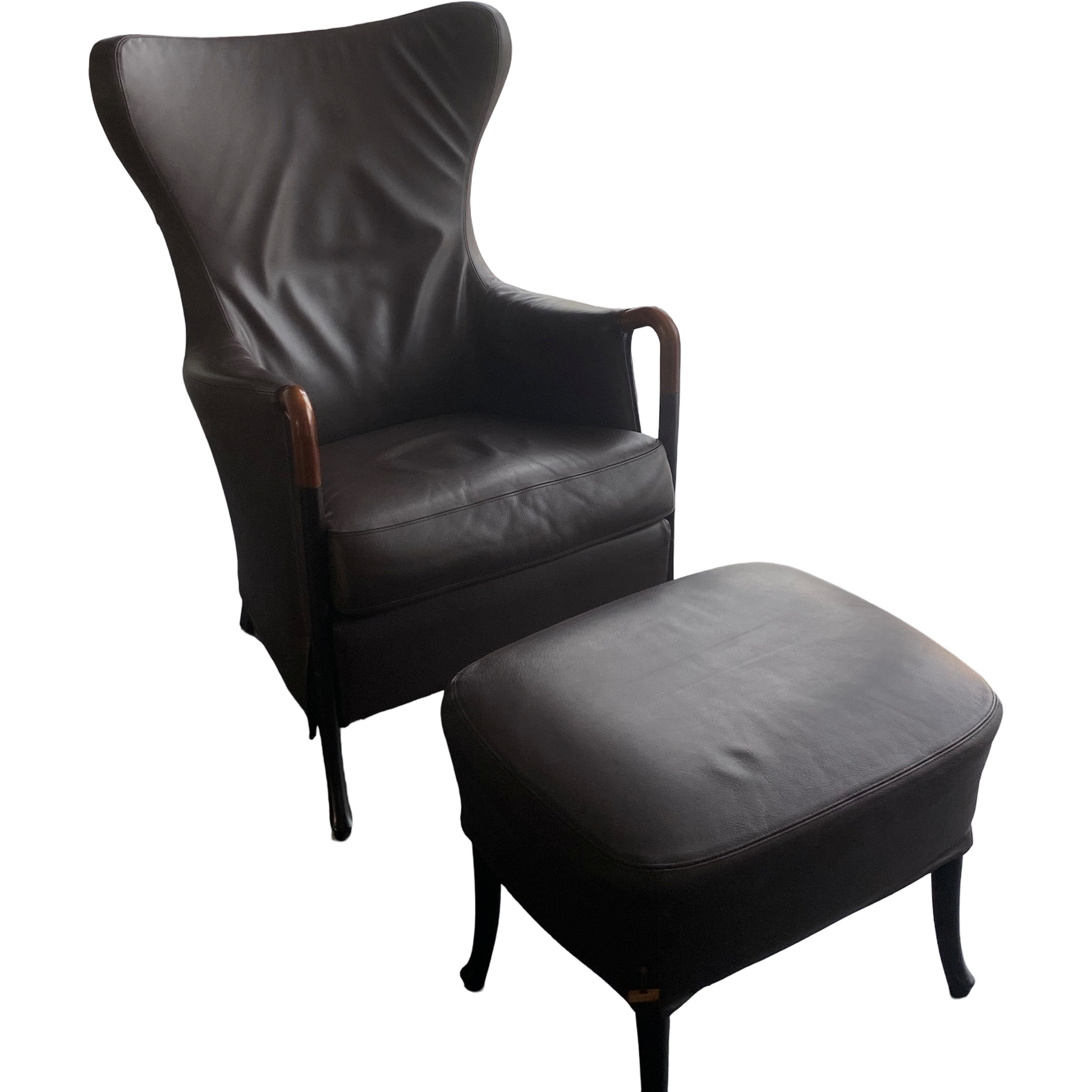 Der passende Hocker rundet das Ensemble ab und sorgt für maximale Entspannung – eine perfekte Balance zwischen Handwerkskunst und Design. Ein edles Stück, ideal für Wohnräume oder gemütliche Leseecken mit starkem Charakter.