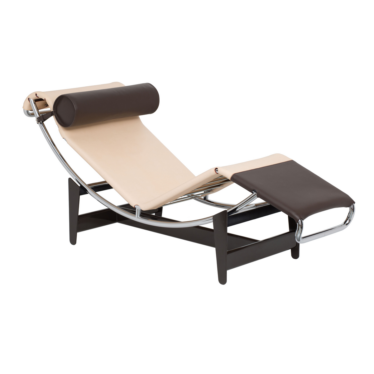 Ein verstellbarer Rahmen aus verchromtem Stahl, eine Basalt-farbene Basis und ein selbsttragendes Polster, das mittels Federn direkt am Gestell befestigt ist – ganz wie auf einem historischen Foto von Perriand selbst.