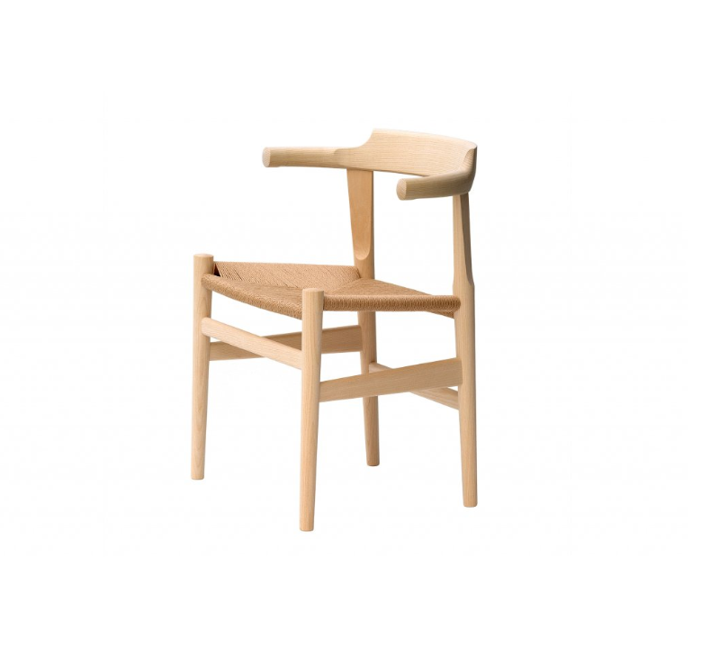 Der Stuhl wurde für lange Abende am Esstisch konzipiert und zählt zu den wenigen Wegner-Modellen, die sich ohne Armlehnen komplett unter den Tisch schieben lassen. Die Sitzfläche aus handgeflochtener Papierkordel sorgt für Komfort und eine warme, zurückhaltende Ästhetik.