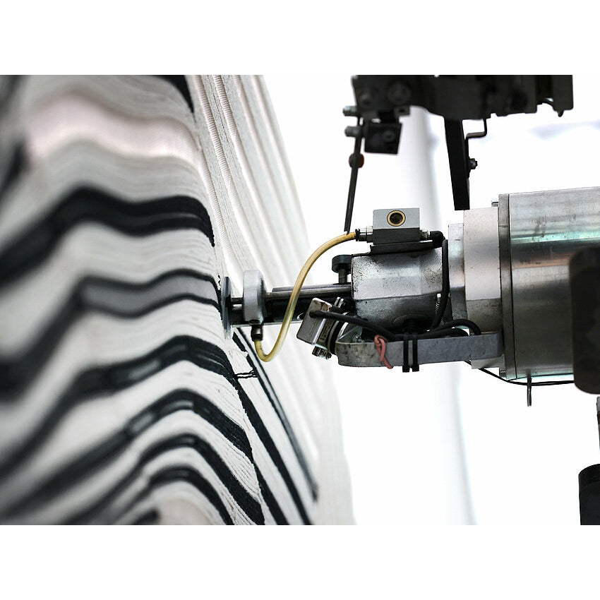 Ein Teppich, der aus dem kreativen Archiv von Trix und Robert Haussmann hervorgeht und von Ruckstuhl zeitgemäß interpretiert wurde. Das Faltenwurf- und Streifenmotiv, inspiriert vom leichten Spiel eines schwarz-weiss gestreiften Seidenschals, entfaltet sich hier als textiler Bodenbelag mit starkem ästhetischem Ausdruck. Die Kollektion verbindet die Schweizer Designgeschichte mit innovativer und nachhaltiger Materialität, da die Oberschicht zu 60 % aus recycelter Wolle von hochwertigen Post-Consumer-Kleidungsstücken gefertigt ist.