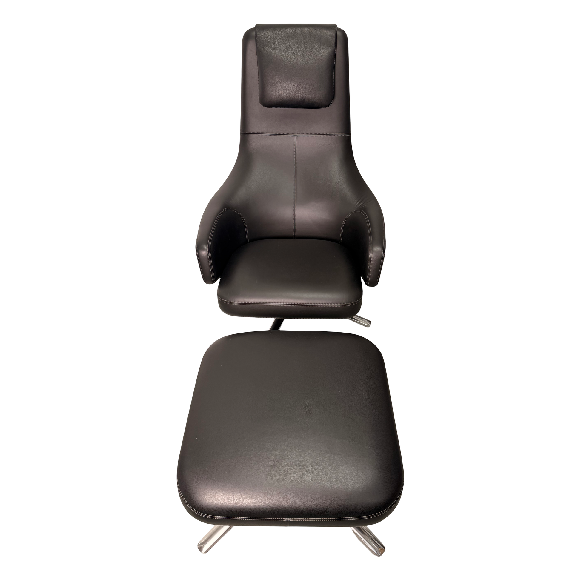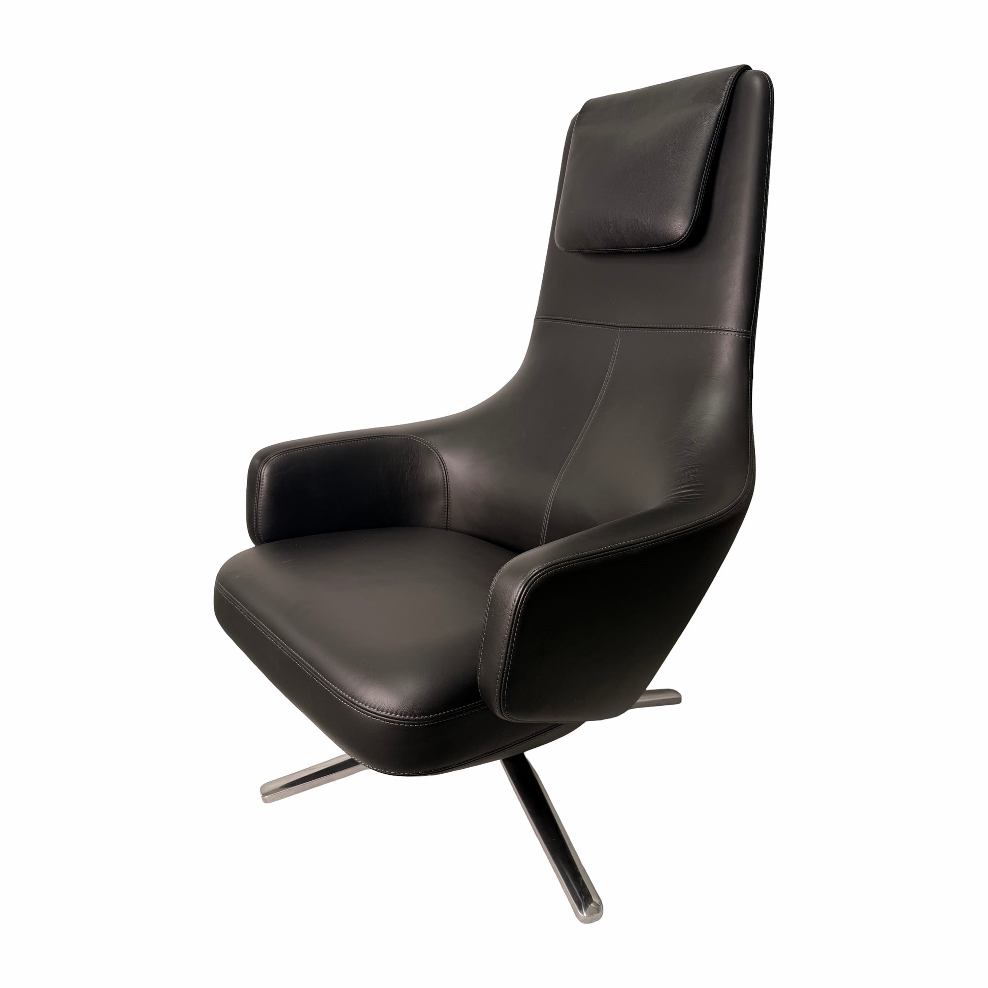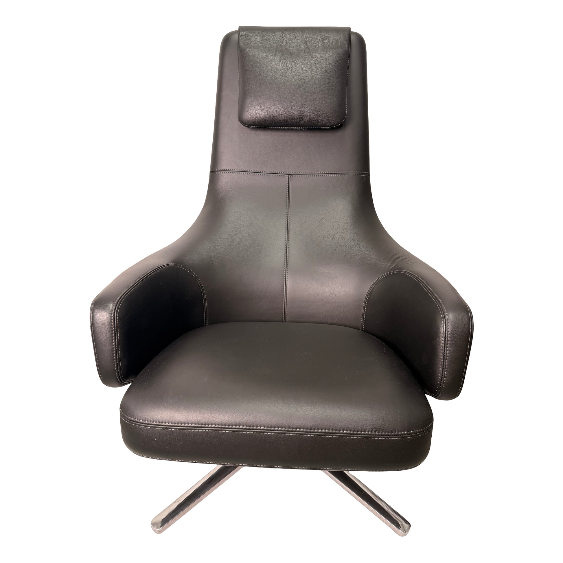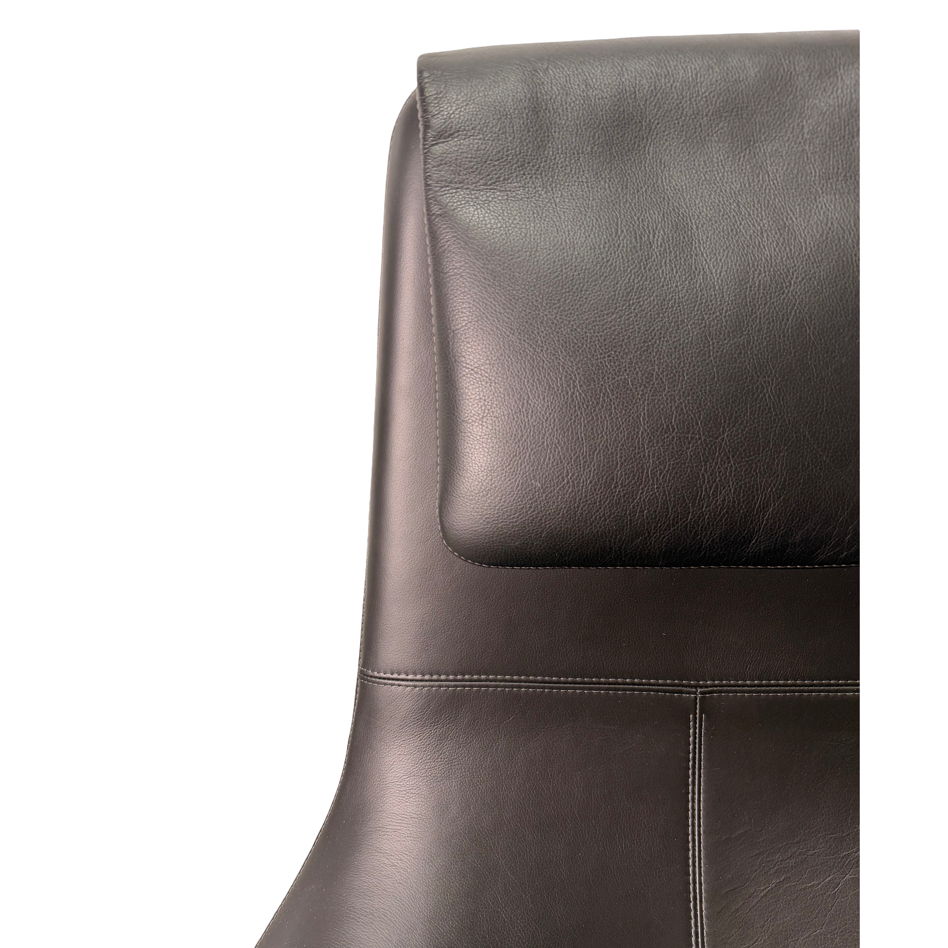 Die weichen, fliessenden Linien, die hohe Rückenlehne mit integriertem Kopfteil sowie die grosszügigen Armlehnen bieten eine natürliche Unterstützung und laden sofort zum Entspannen ein. Feine, präzise Nähte unterstreichen die hochwertige Verarbeitung des Leders und verleihen dem Sessel eine elegante, fast massgeschneiderte Anmutung.