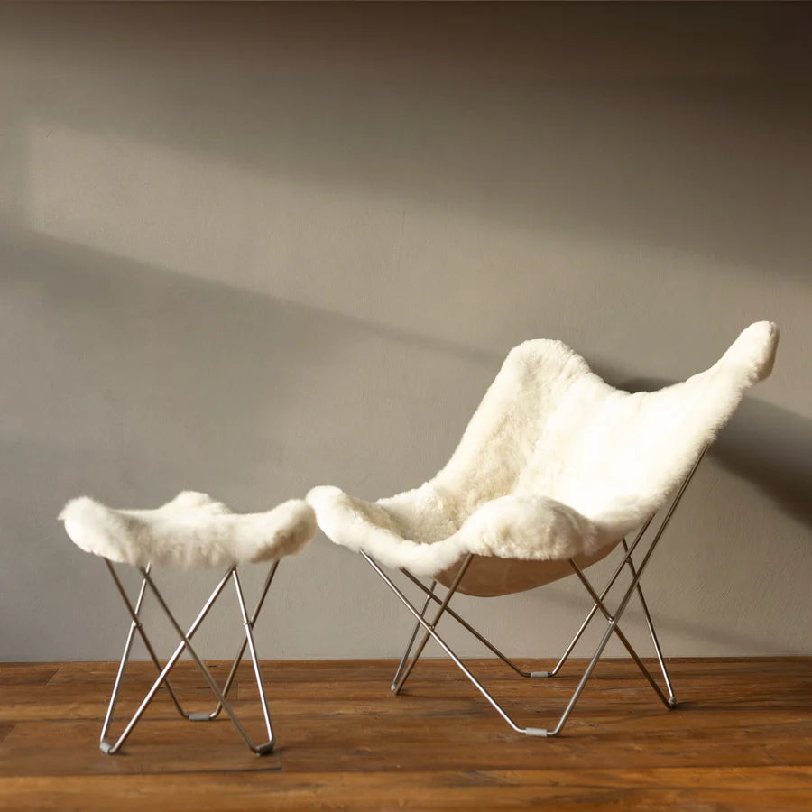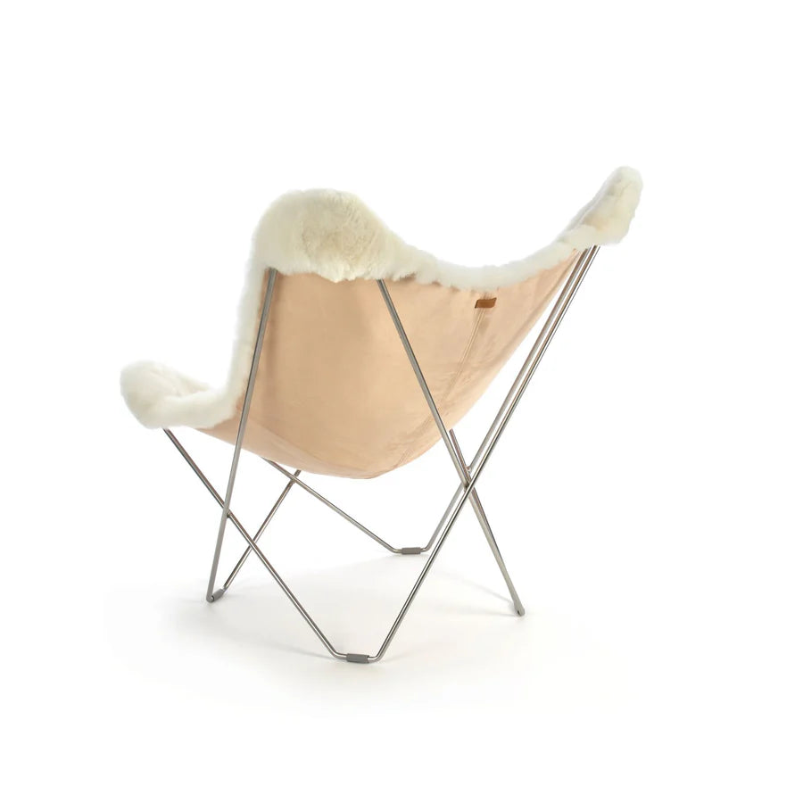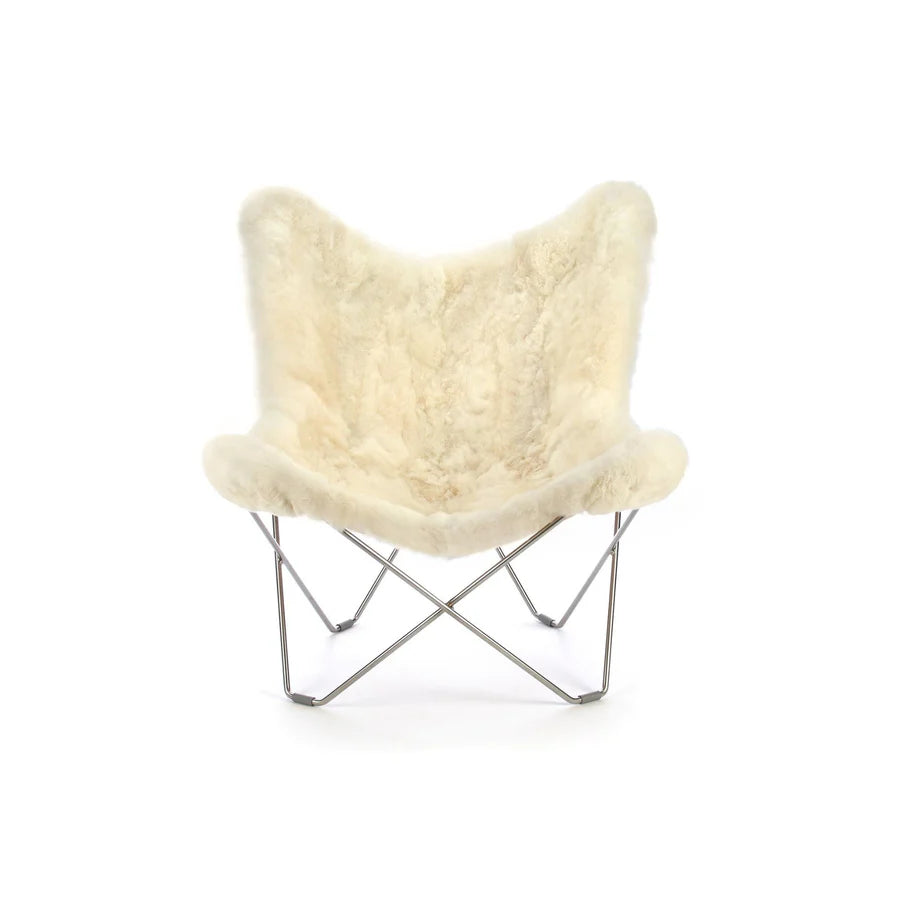 Unsere Neuinterpretation des Butterfly Chair vereint ergonomisches Design, zeitlose Ästhetik und natürlichen Komfort. Das Gestell aus mattem Chromstahl, gefertigt nach der Originalform der Designikone, wird vollendet durch einen außergewöhnlich weichen Bezug aus feinster Royal-Alpaka-Faser – ein Sitzgefühl, das seinesgleichen sucht.